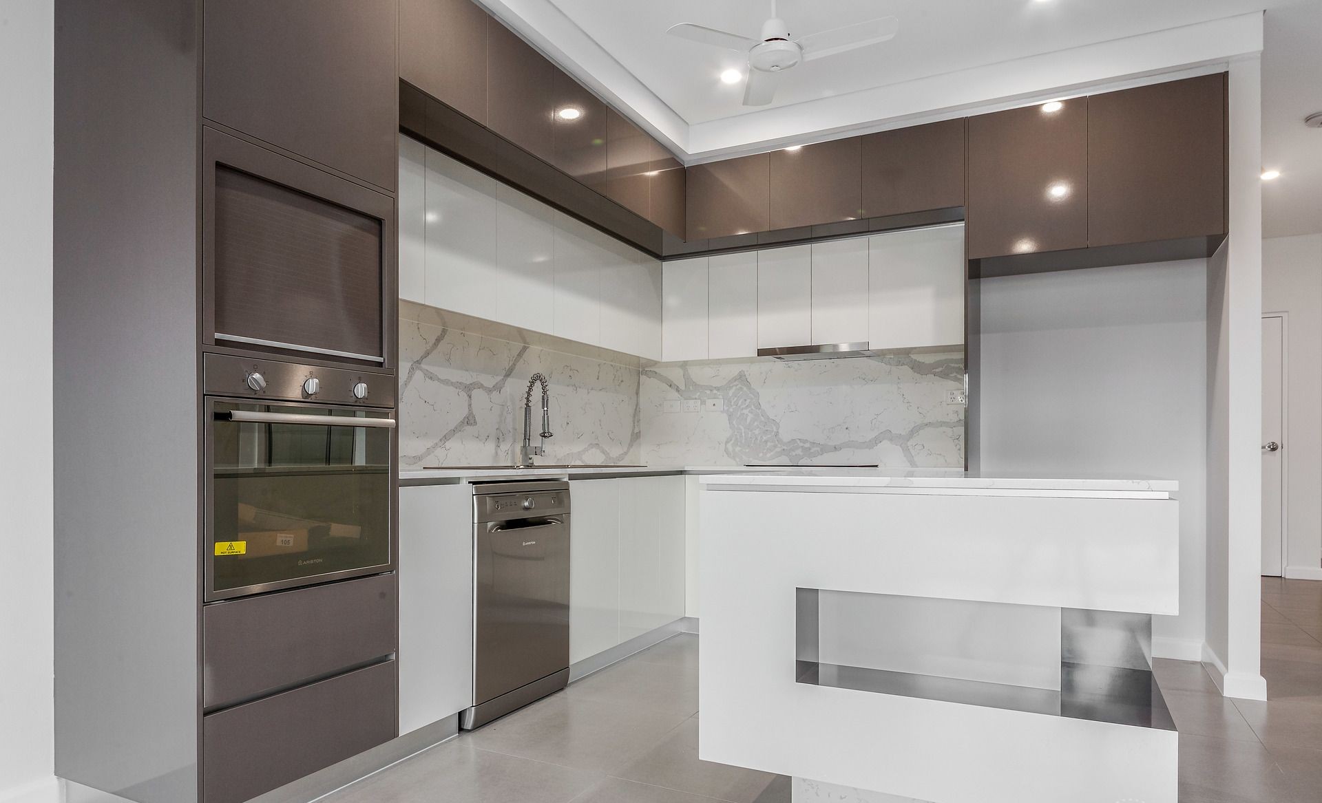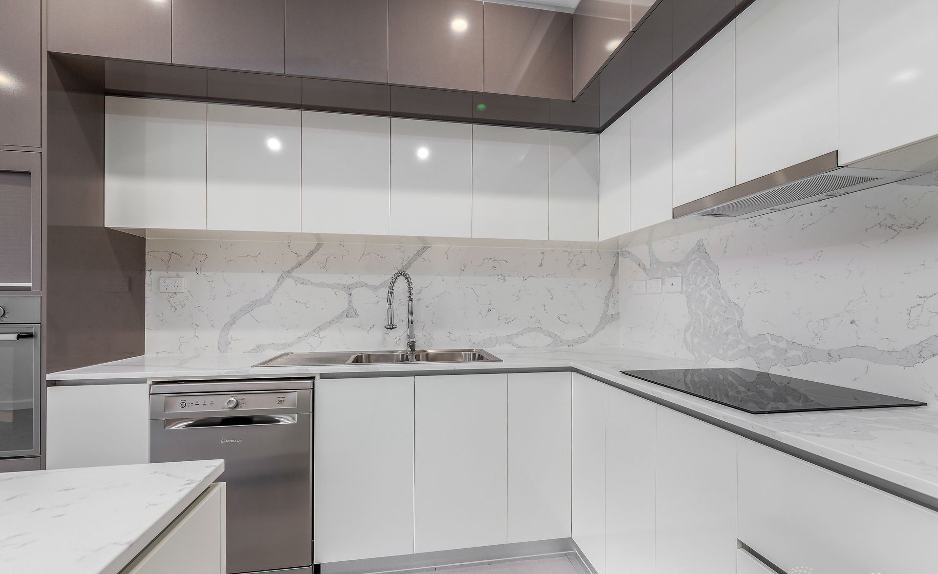 Modern kitchen with stone benchtops, breakfast bar, and stainless steel appliances