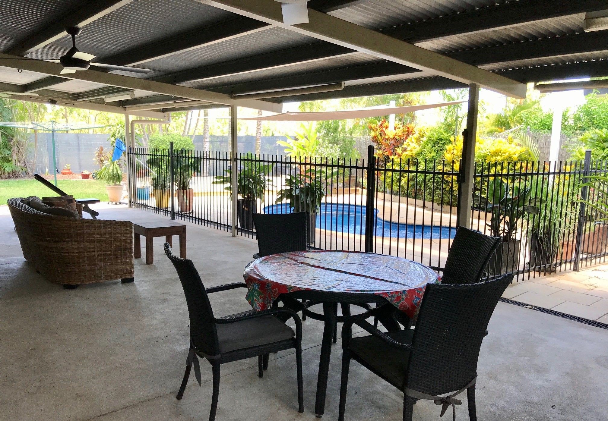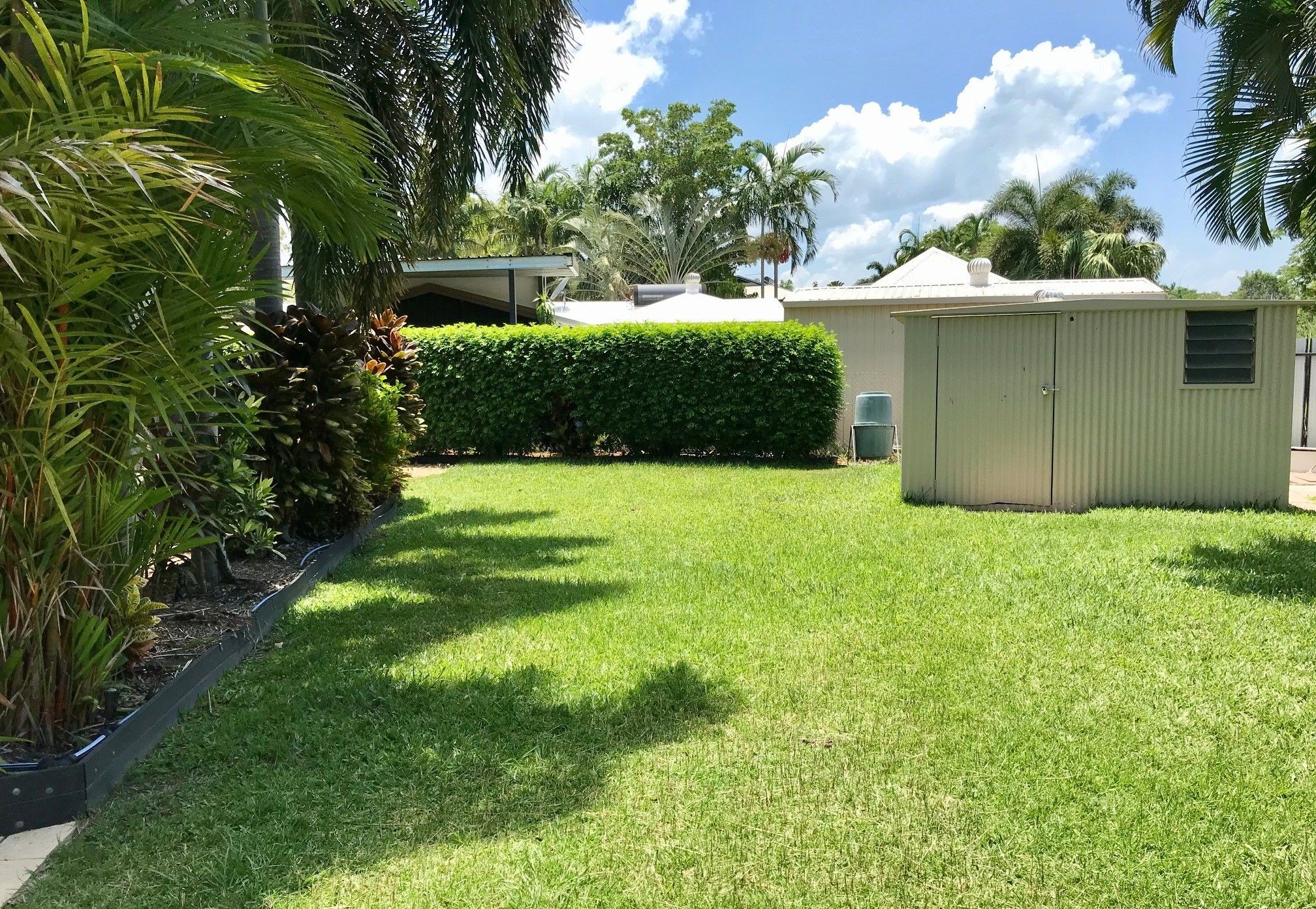 Ground-level, 3-bedroom home, 2 bathroom home with solar power surrounded by tropical gardens with beautiful outdoor entertaining area with shed.